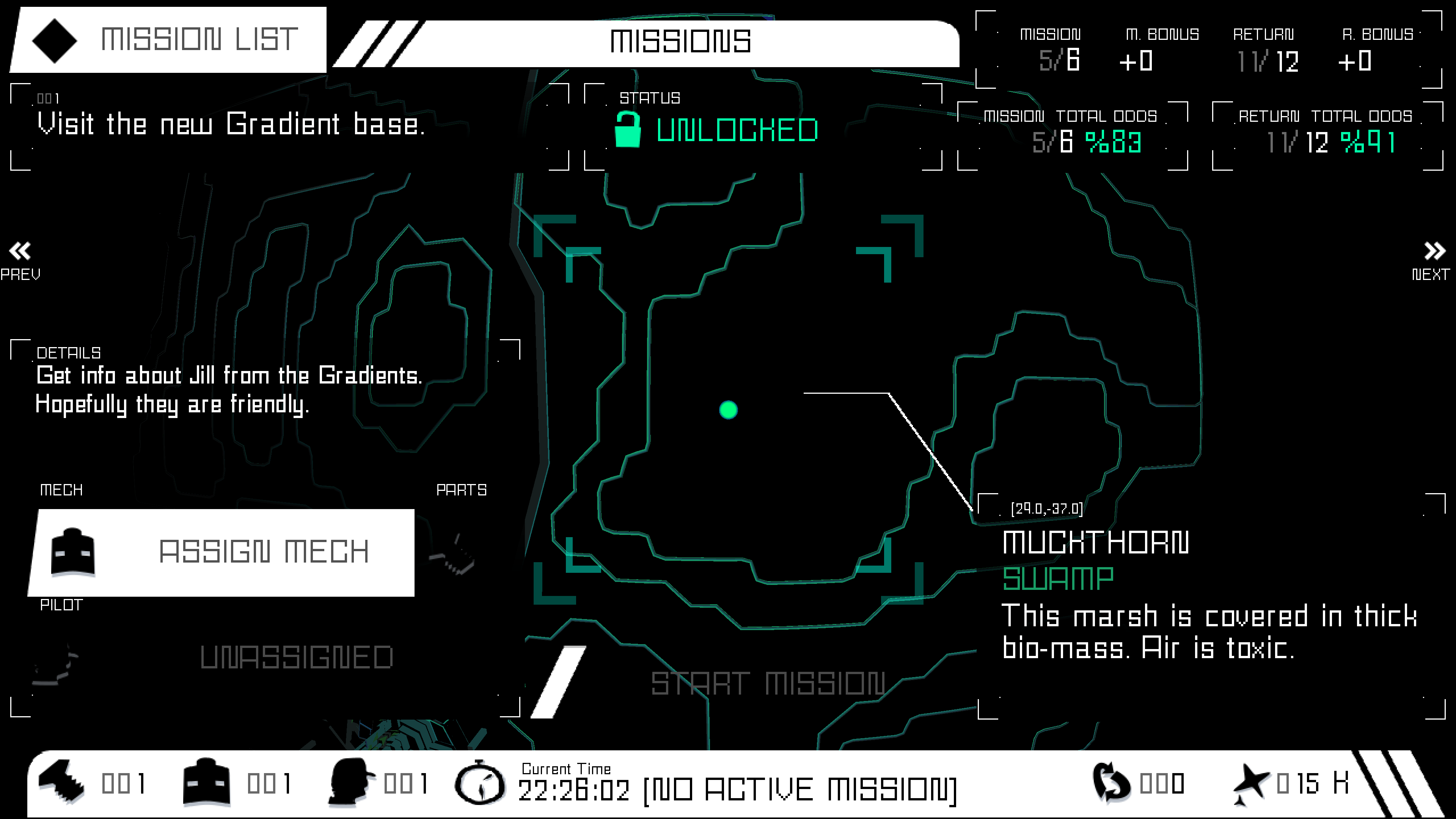 MISSIONS - Once you have unlocked a mission, you need to assign a mech and a pilot to it before you can start it.