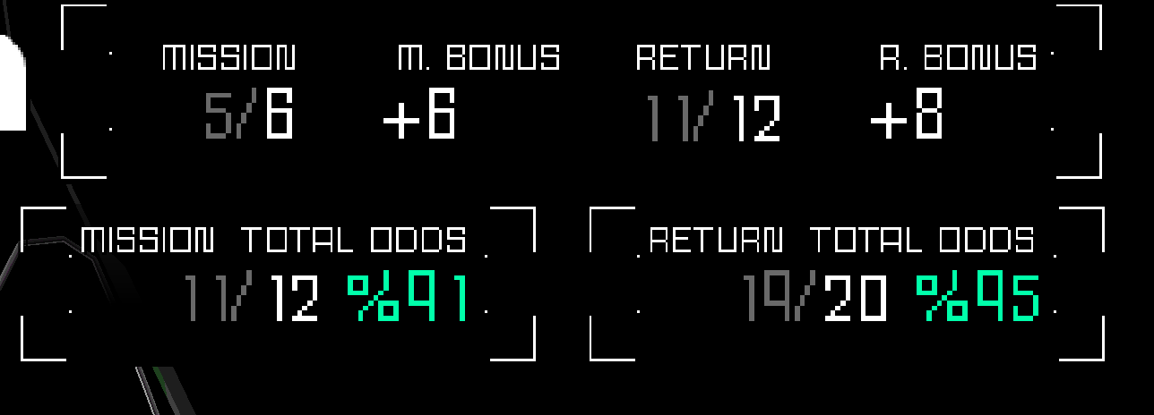 MISSION ODDS, MISSION BONUS, RETURN ODDS, RETURN BONUS - What do the numbers mean? the 5/6 means you have a 5 in 6 chance of succeeding at this mission without taking any extra damage to your mech. If the mission odds are 5/6 and the bonus is +6, you are going to add +6/+6 to both sides of the odds. You can think of it like adding 6 more sides to the "dice".